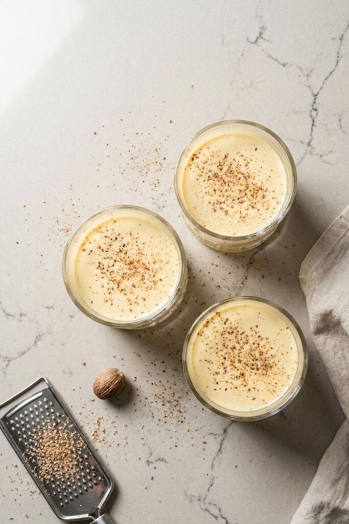 - Serve: When ready to serve, pour into glasses and grate extra nutmeg on top. (Optional: To make it fluffier, whip 4–6 egg whites or extra heavy cream to soft peaks and fold into the nog just before serving).