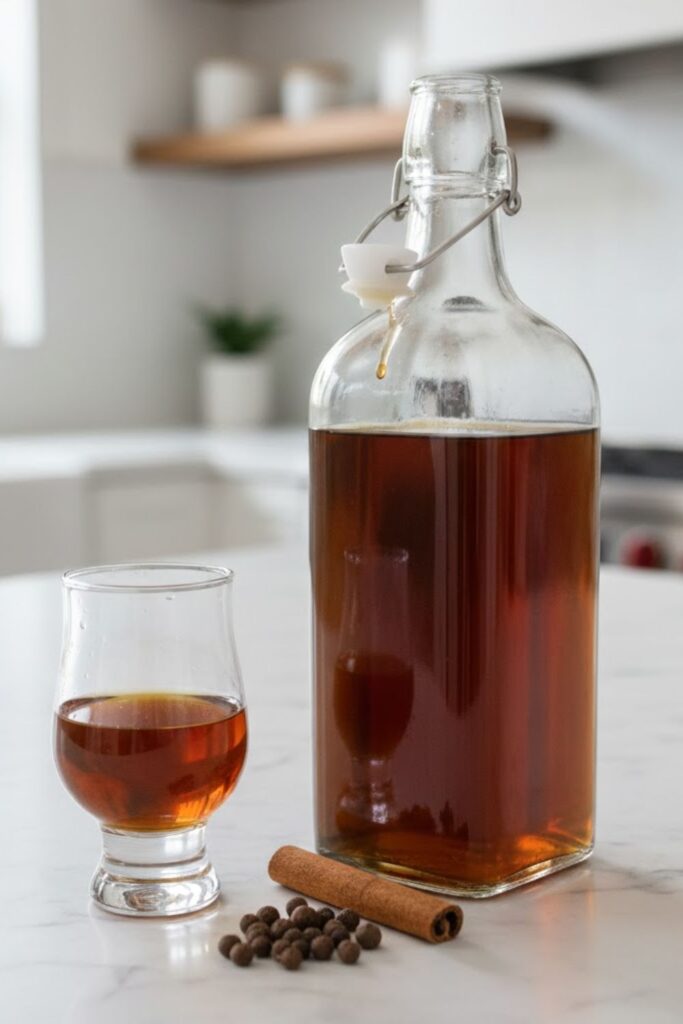 Store your finished Allspice Dram in a sealed glass bottle or jar at room temperature. Because of the high alcohol content and sugar, it is shelf-stable and will last indefinitely, though the flavors may mellow slightly after the first year. There is no need to refrigerate it.