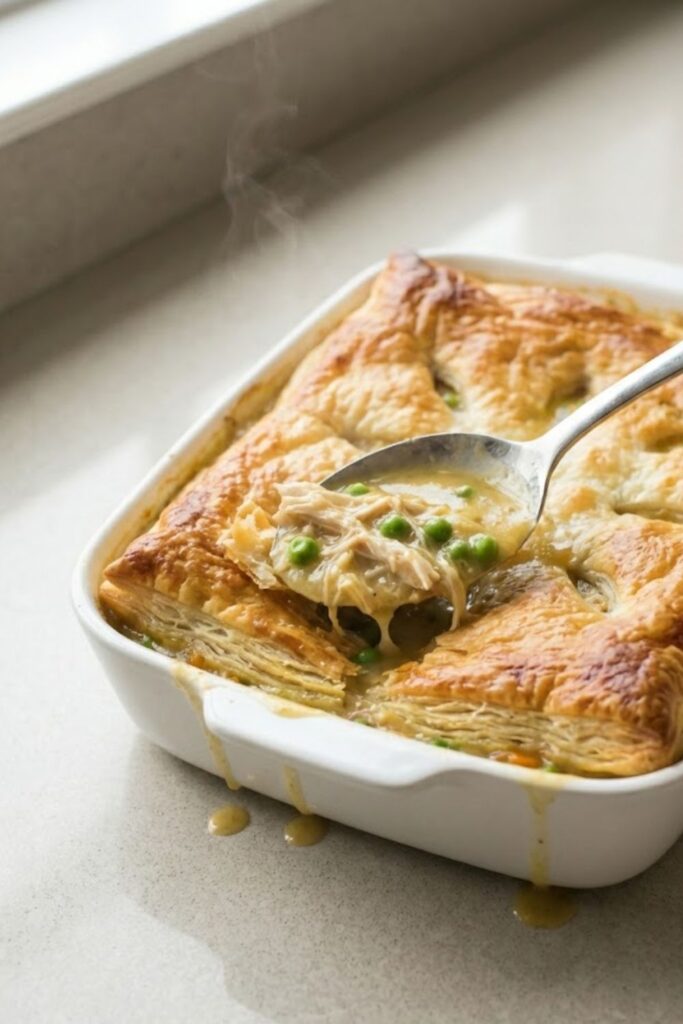- Cool: Let the pot pie cool for 10 minutes before serving to allow the filling to set slightly (it will be lava-hot).