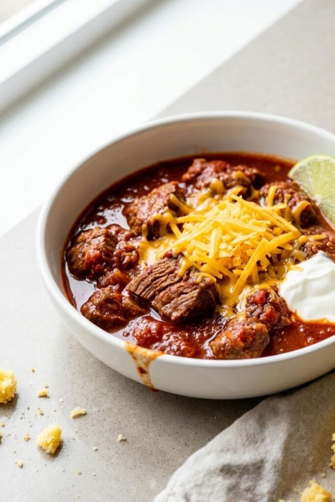 A robust, no-bean beef chili featuring hand-cut chuck roast and a signature corn tortilla chip thickener for deep flavor and perfect texture.