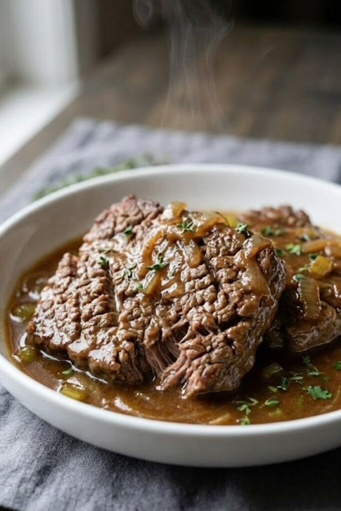 A masterclass in “Low and Slow” cooking. By using mechanical tenderization (needling) followed by a 2-hour braise in an acidic tomato-based liquid, even the toughest bottom round is transformed into a fork-tender delicacy with a rich, built-in gravy.