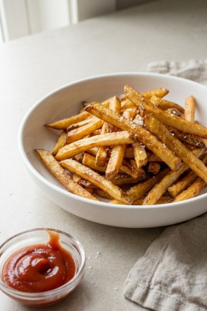 French fries are best enjoyed immediately while they are hot and crisp. If you have leftovers, they will lose their texture in the fridge, but you can reheat them in an oven or air fryer at 400°F for 5 minutes to restore some crunch. Do not freeze them after the final fry.