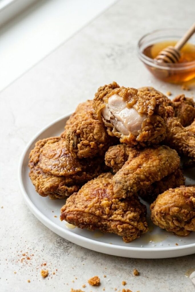 Leftover fried chicken can be stored in the refrigerator for up to 3 days. To reheat, place the chicken on a wire rack in a 350°F oven for 15-20 minutes until the skin crisps up again. Never microwave leftover fried chicken unless you want a soggy, rubbery mess.