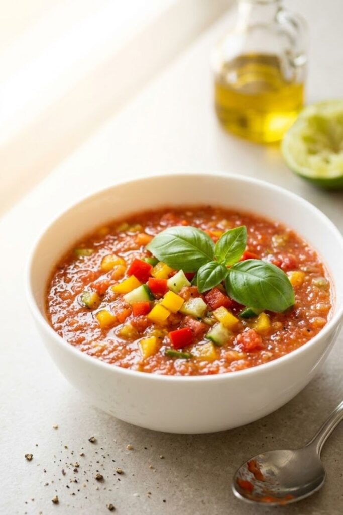 A vibrant, chilled Spanish soup that balances fresh garden vegetables with a complex acid profile, utilizing a “partial blend” technique for the perfect thick-yet-chunky texture.