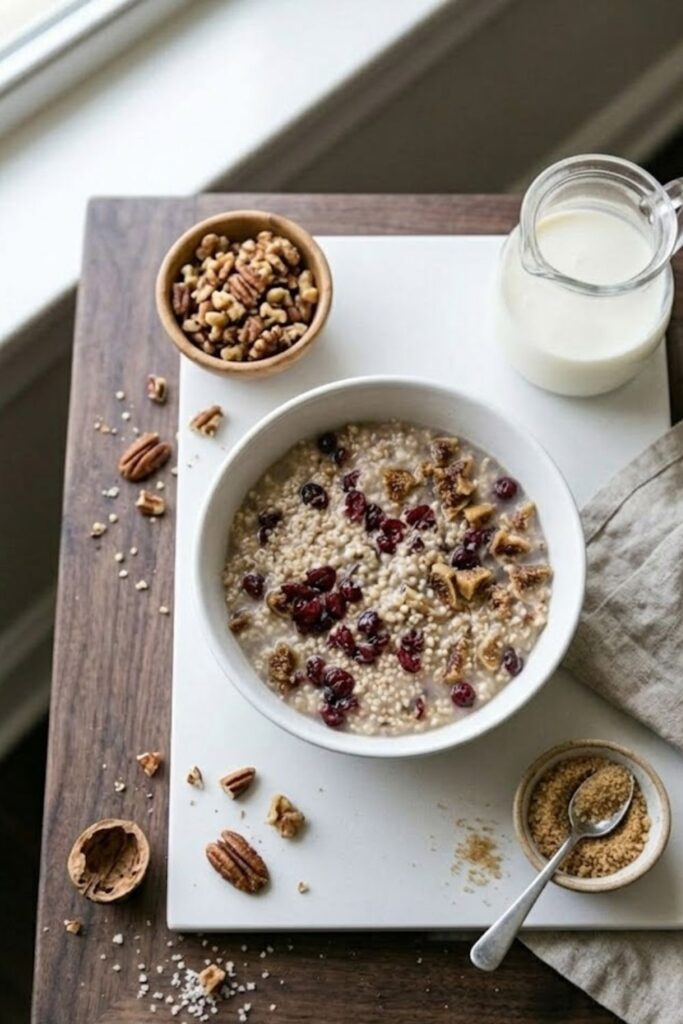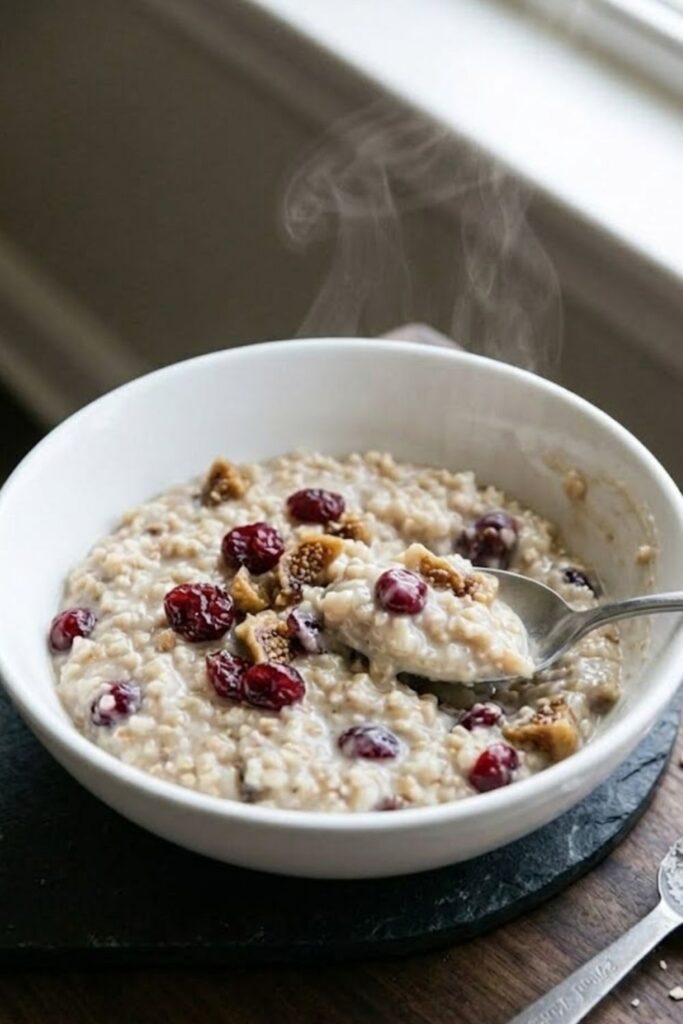 Since this recipe already includes dried fruit, I prefer serving it with something crunchy like toasted walnuts or pecans to contrast the soft texture. A splash of extra cold cream and a sprinkle of brown sugar can also be added at the table for those who prefer a sweeter breakfast.
