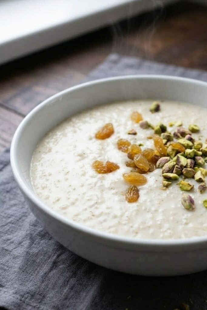 - Finish and Cool: Remove the pan from the heat. Stir in the golden raisins and chopped pistachios until well distributed. Transfer the pudding to individual serving dishes or a large bowl, cover with plastic wrap pressed directly against the surface, and chill before serving.
