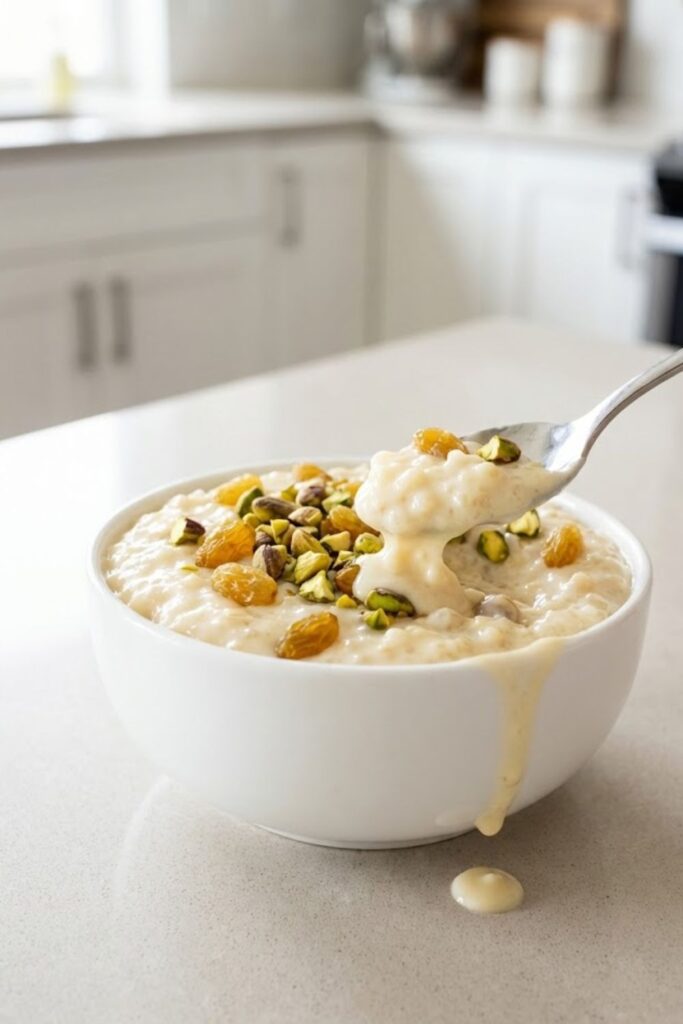 - Final Fold: Once thickened, remove the pan from the heat. Gently stir in the golden raisins and chopped pistachios until well distributed. Transfer to serving bowls and serve warm, or cover with plastic wrap touching the surface and chill before serving.