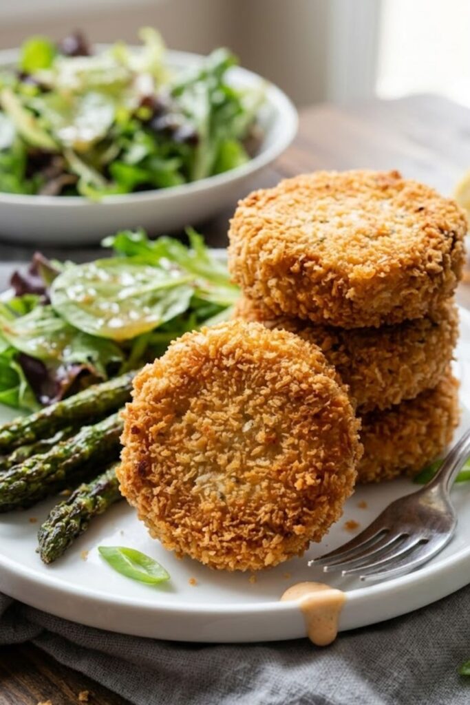 - Coat and Chill: Place the remaining 1/2 cup of panko in a shallow dish. Press each patty gently into the crumbs to coat both sides. Place the coated croquettes on a plate, cover loosely with plastic wrap, and refrigerate for at least 30 minutes.