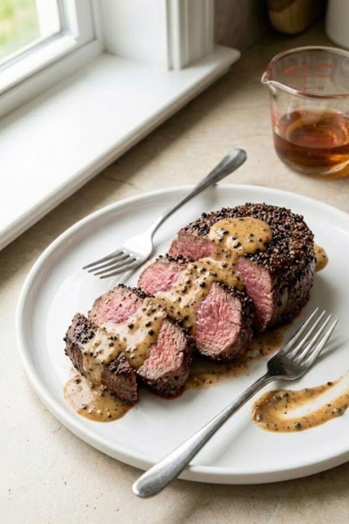 This Alton Brown Steak Au Poivre recipe is a sophisticated and peppery main course, which calls for tender filet mignon and a rich Cognac cream sauce. It’s a steakhouse classic you can make at home, ready in about 30 minutes.