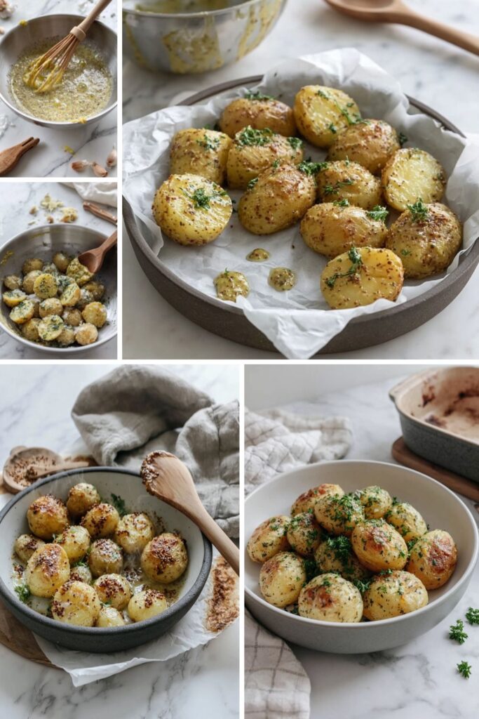 Barefoot Contessa Mustard Roasted Potatoes Recipe is a classic American side dish made with baby Yukon Gold potatoes and a sharp mustard glaze. This traybake uses Dijon and whole-grain mustard mixed with garlic and fresh thyme to create a crisp, golden crust on every halved potato.