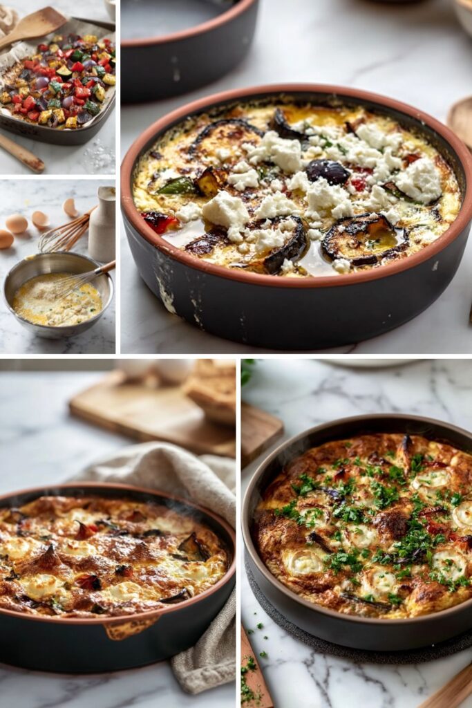 - Assemble the frittata: Grease a 23cm (9in) round ceramic baking dish or a cast-iron skillet with a little oil or butter. Spread the roasted vegetables in a flat layer across the bottom and pour the egg mixture evenly over them. Dot the remaining goat cheese across the surface so everyone gets a piece.