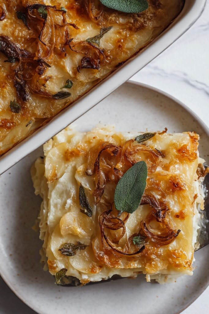 A decadent, restaurant-quality potato gratin with 11 paper-thin layers of potato, baked in heavy cream, and topped with sweet caramelized shallots and crispy fried sage.