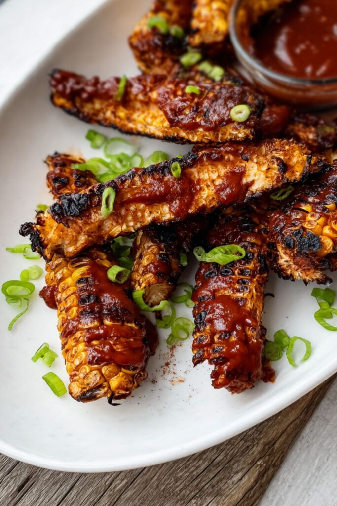 - Finish and Serve: Transfer the corn ribs to a serving platter. Brush with additional BBQ sauce and a sprinkle of the seasoning blend, if desired. Garnish with thinly sliced scallion and serve with any remaining BBQ sauce.