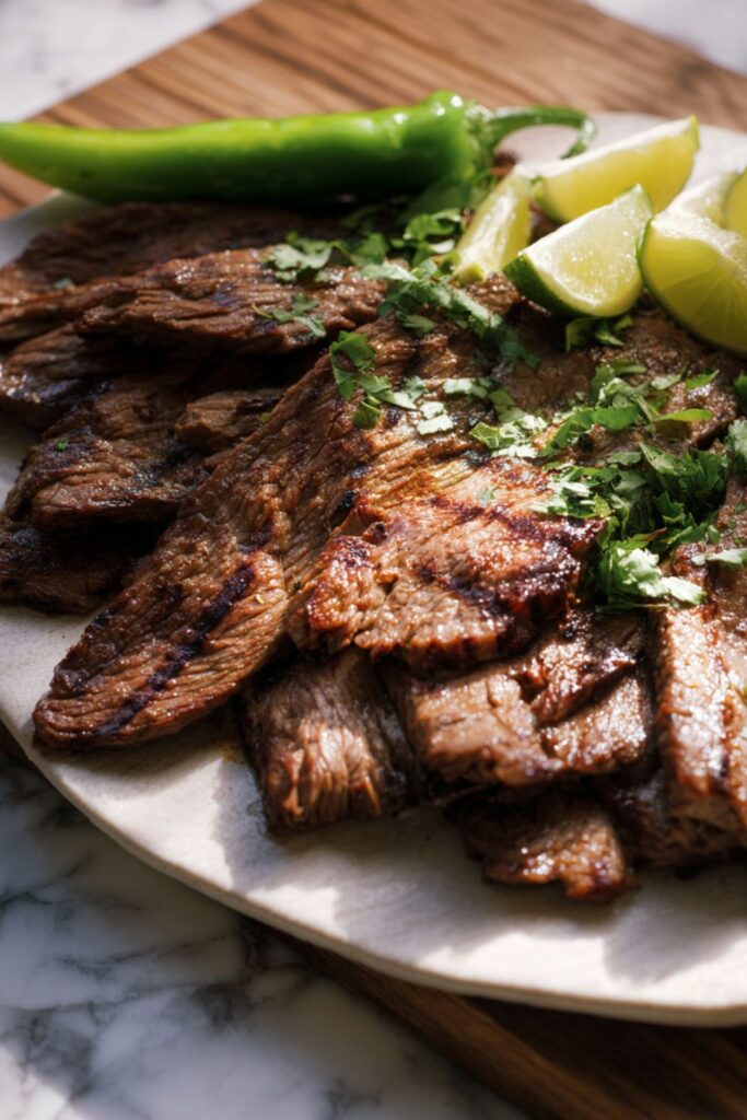 This Bobby Flay Carne Asada recipe features skirt steak marinated in a robust blend of soy sauce, lime, and toasted cumin, grilled to charred perfection for the ultimate taco night.