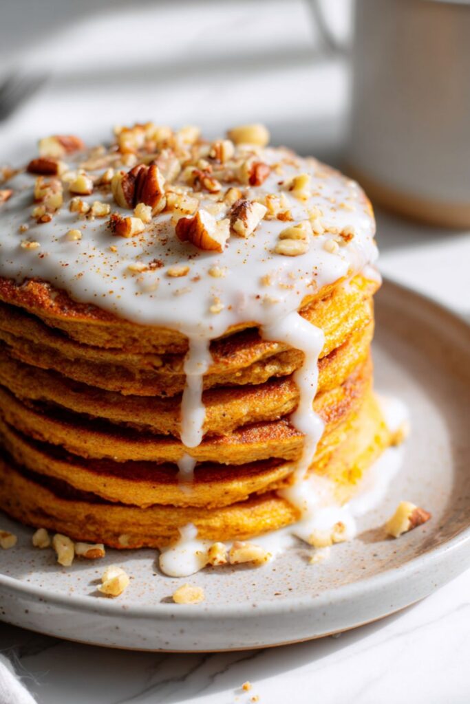 - Serve: Stack the warm pancakes on plates, top generously with the maple-cream cheese drizzle, and garnish with extra chopped pecans if desired.