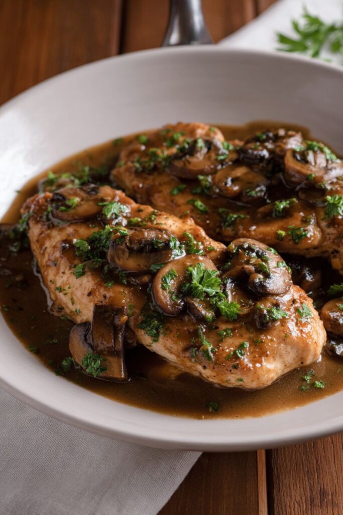 A classic Italian-American dish featuring golden pan-fried chicken cutlets simmered in a rich, glossy sauce of mushrooms and dry Marsala wine.