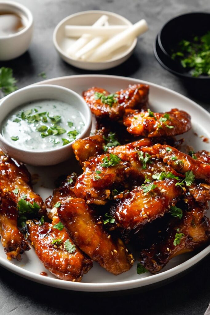 - Toss and serve: Place the hot fried wings into the large pan with the warm sauce and toss until evenly coated. Transfer to a platter, garnish with chopped cilantro, and serve immediately with the jicama sticks and the chilled blue cheese sauce.