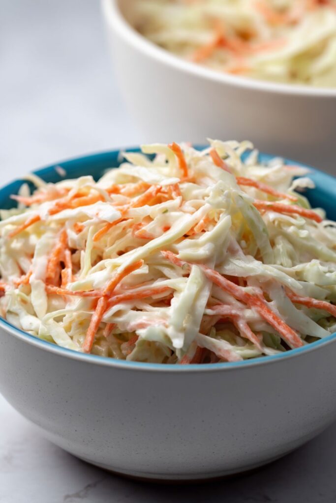 A classic American side dish featuring crisp cabbage and carrots tossed in a tangy, creamy mayonnaise dressing with a hint of celery salt.