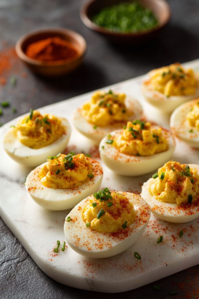 - Fill and garnish: Transfer the filling to a piping bag (or a sealable plastic bag with the corner snipped off). Pipe the mixture generously into the hollow of each egg white. Dust with smoked paprika and sprinkle with chopped chives. Refrigerate for at least 20–25 minutes before serving to let the flavors set.