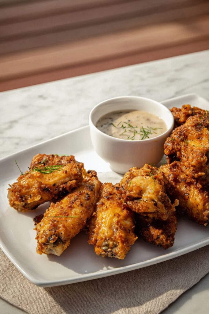 - Serve: Let the wings rest for 5 minutes, then serve hot with the chilled homemade ranch dressing.