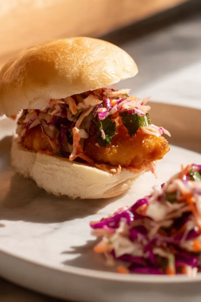 A crispy, juicy fried chicken sandwich with a Korean twist, featuring a spicy Gochujang mayo and a crunchy, tangy kimchi slaw.