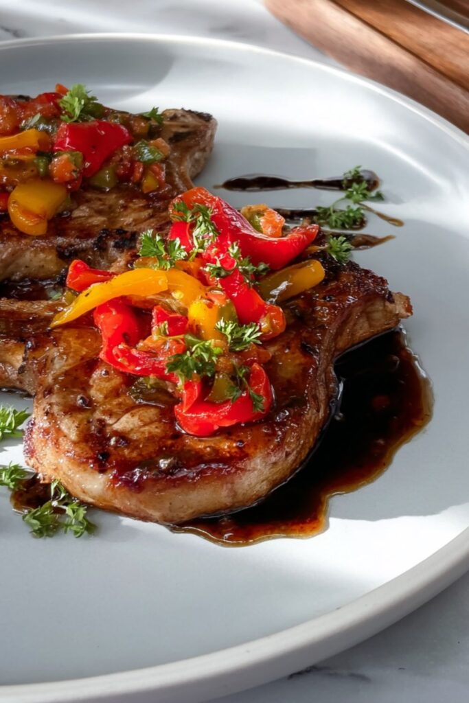 Juicy, bone-in pork chops are grilled with a sweet and tangy balsamic-honey glaze, then topped with a homemade roasted pepper relish and a balsamic reduction.