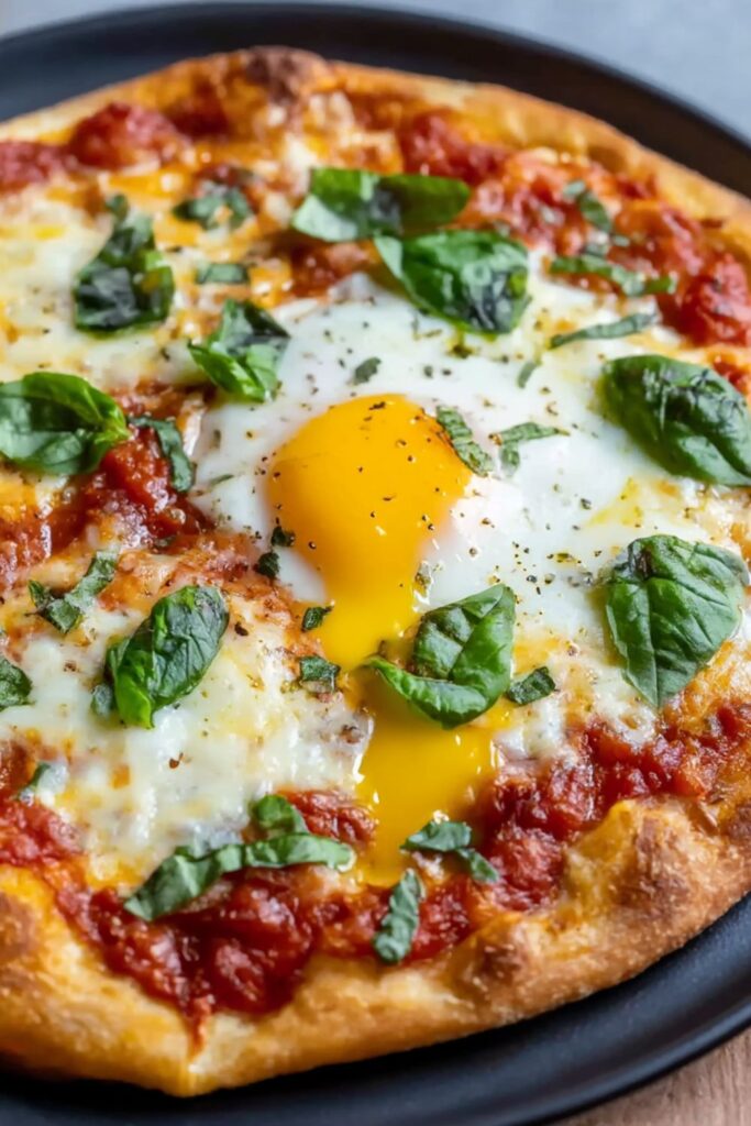 - Top the hot pizza with a fried egg and fresh basil before serving.