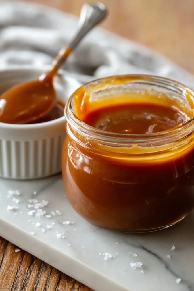 A perfect, rich, and homemade salted caramel sauce with a deep amber color, made with heavy cream and butter.