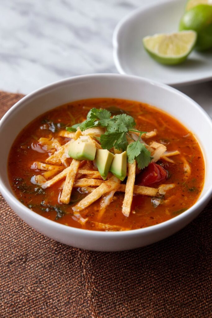 - Serve: Ladle the hot soup into bowls. Top generously with the homemade crispy tortilla strips, lime wedges, and sliced avocado.