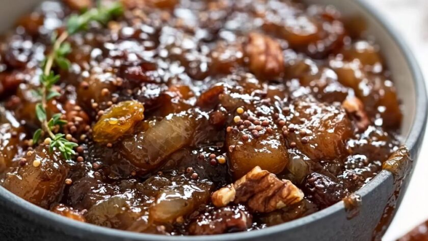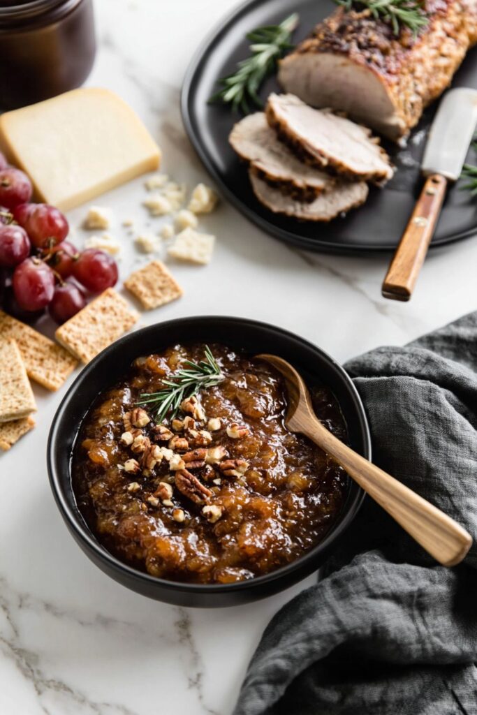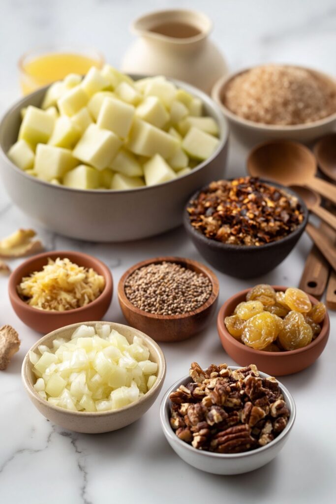 A sweet-sharp apple chutney with ginger, mustard seeds, and toasted pecans that pairs brilliantly with roast pork or a strong cheese.