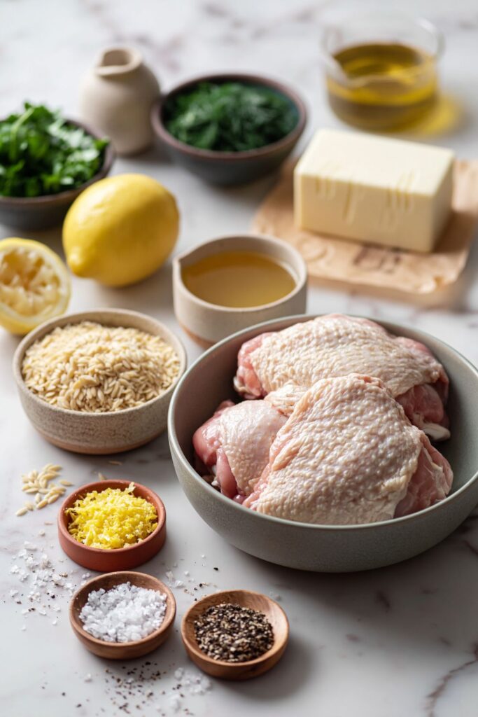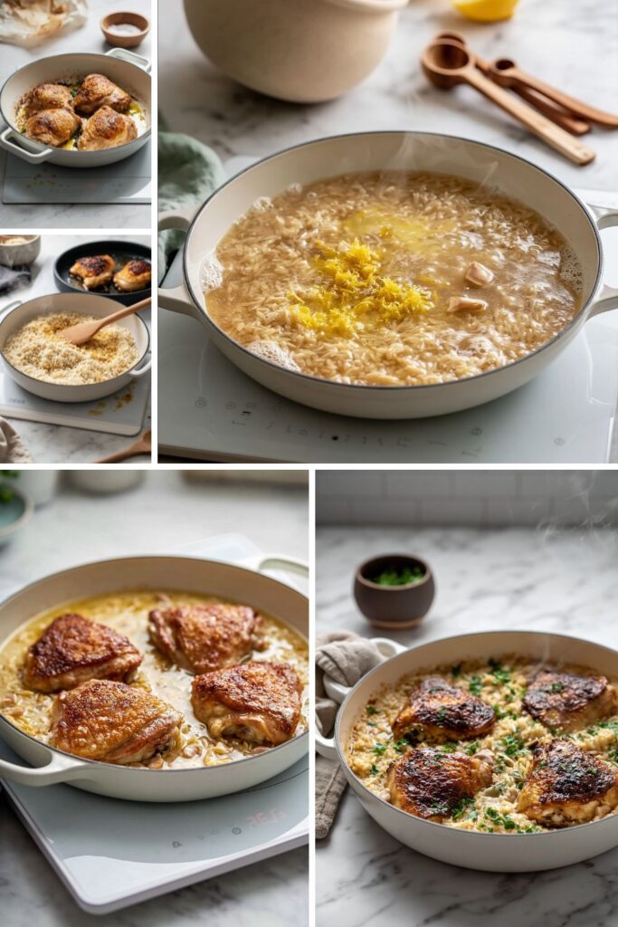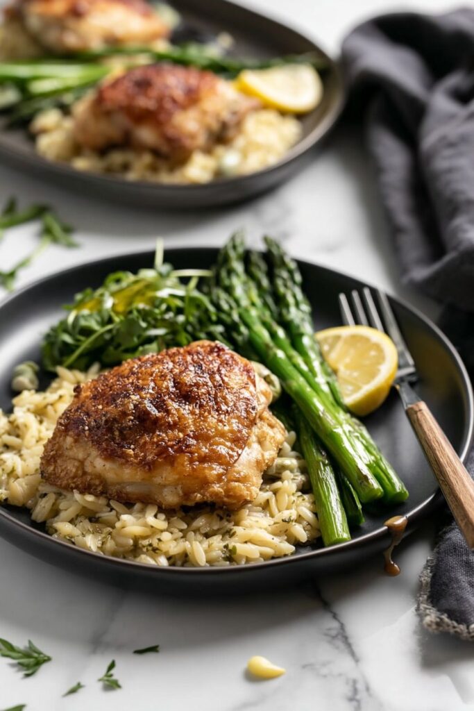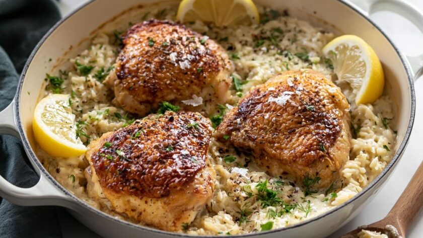 One-pan crispy chicken thighs baked with lemon orzo in chicken stock, finished with butter and fresh herbs for a complete meal.