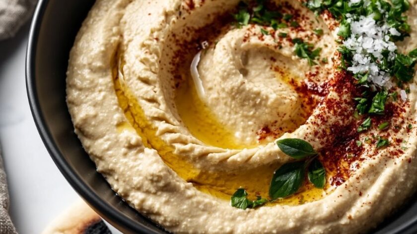 A silky, garlic-infused chickpea dip whipped with tahini and ice water for a light and airy texture.