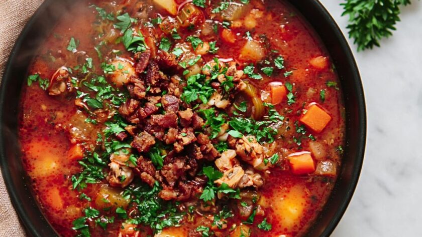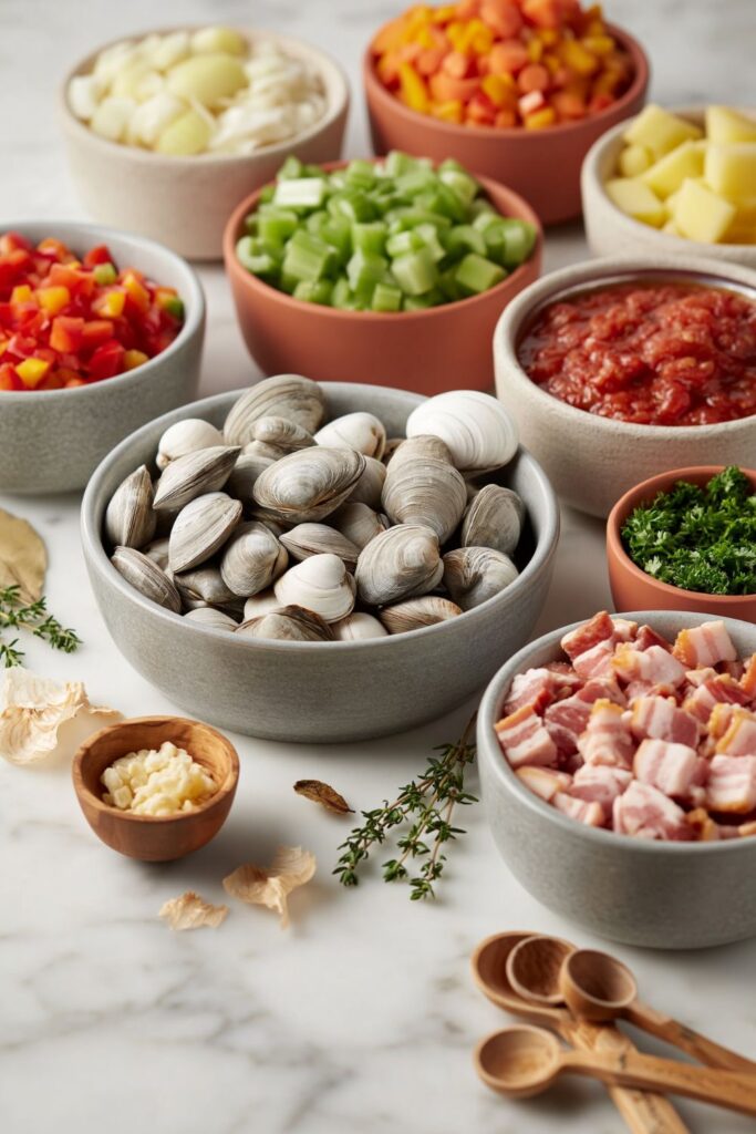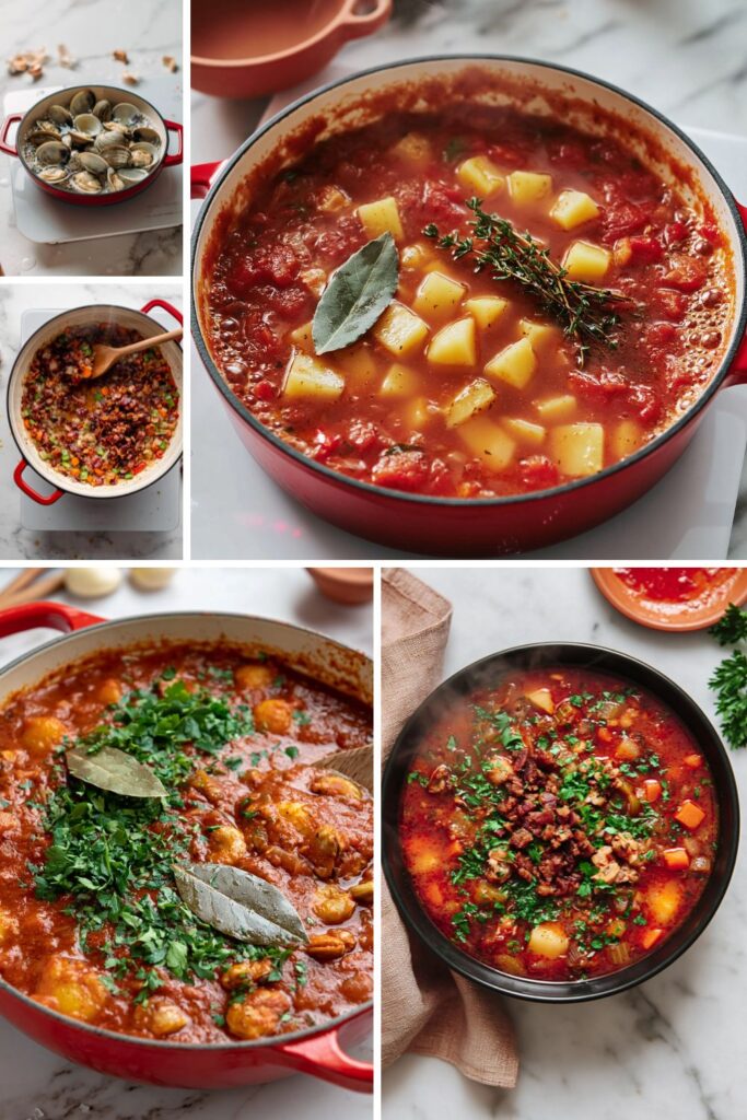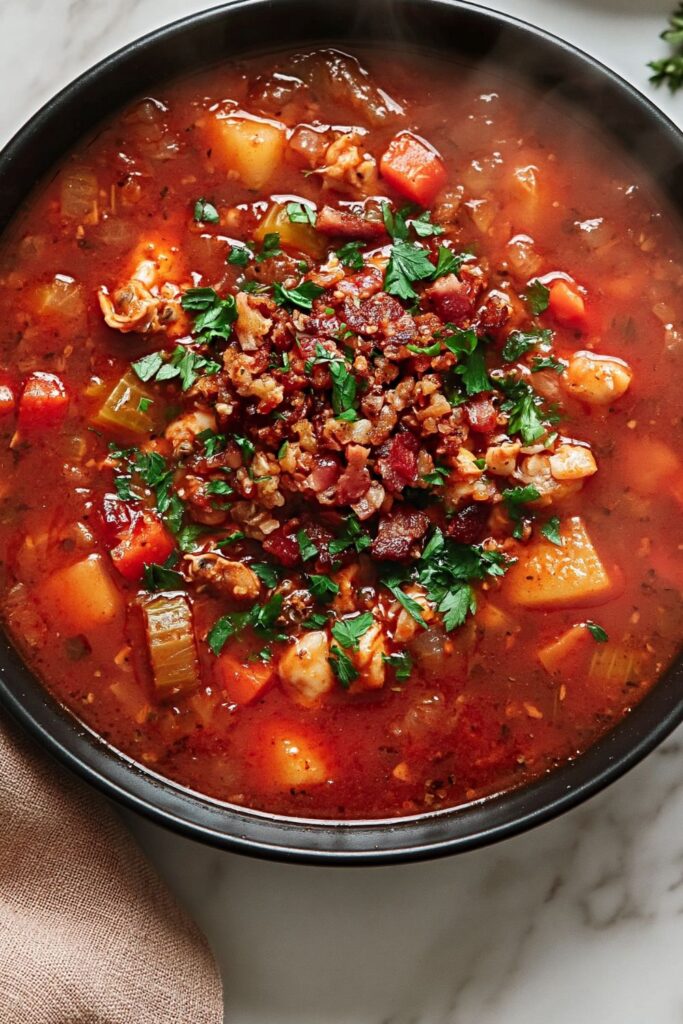 A robust tomato broth brimming with tender clams, smoky bacon, and soft potatoes for a warming coastal meal.