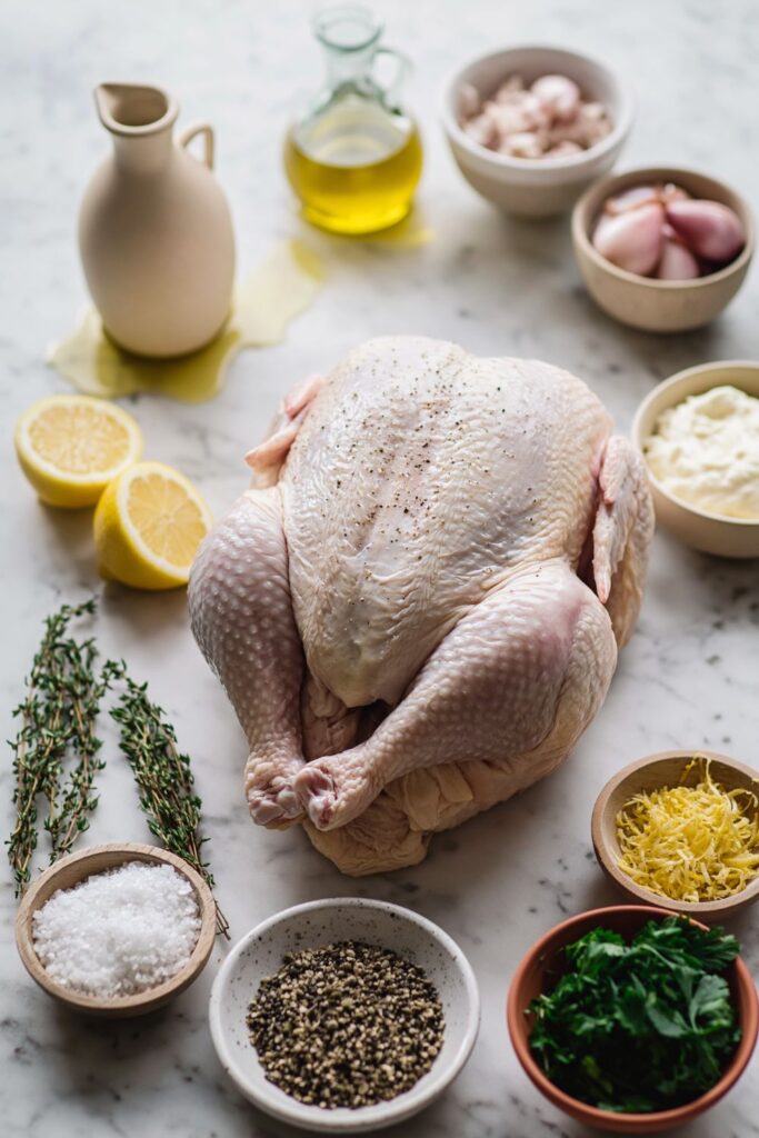- Prep the chicken: Pat the skin dry with kitchen roll and rub the olive oil over the entire surface. Sprinkle the salt and pepper inside the cavity and over the skin before stuffing the lemon halves and thyme sprigs into the centre.