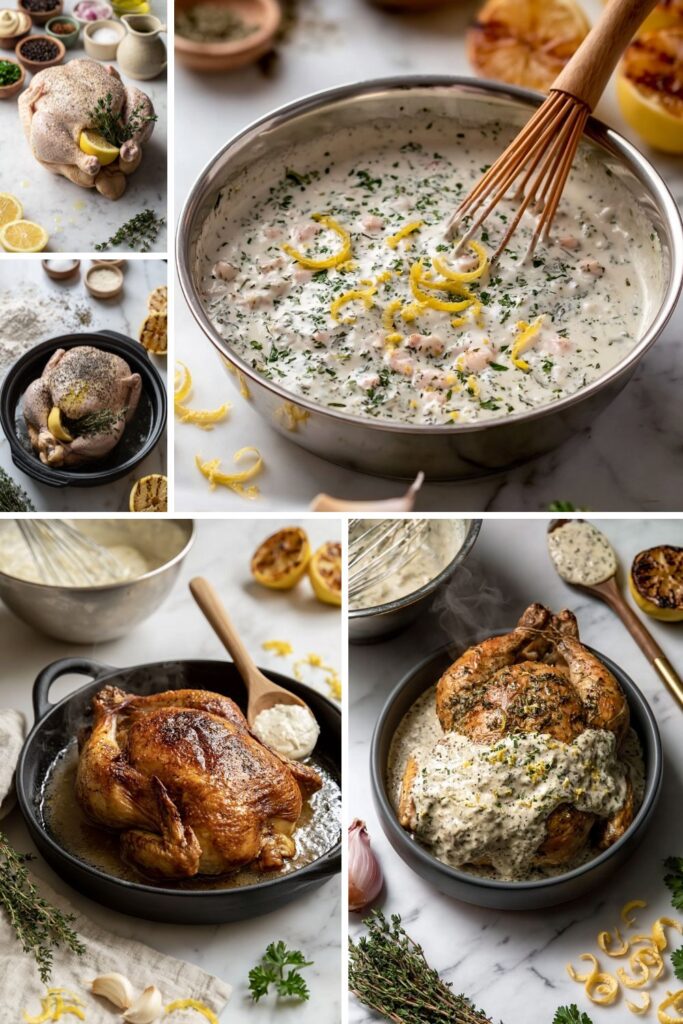 A succulent whole roast chicken smothered in a tangy, shallot-infused crème fraîche sauce that creates its own rich gravy.