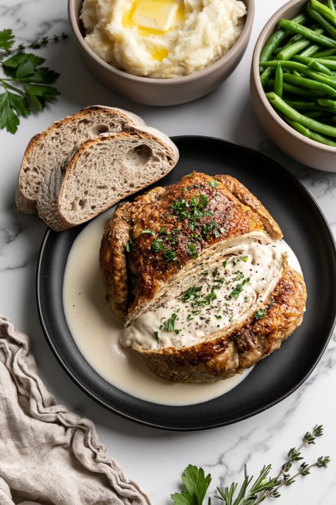 Keep the sides simple to balance the heavy sauce. Steamed green beans with a bit of butter or a crisp green salad with a sharp vinaigrette provide a fresh contrast to the roasted meat.