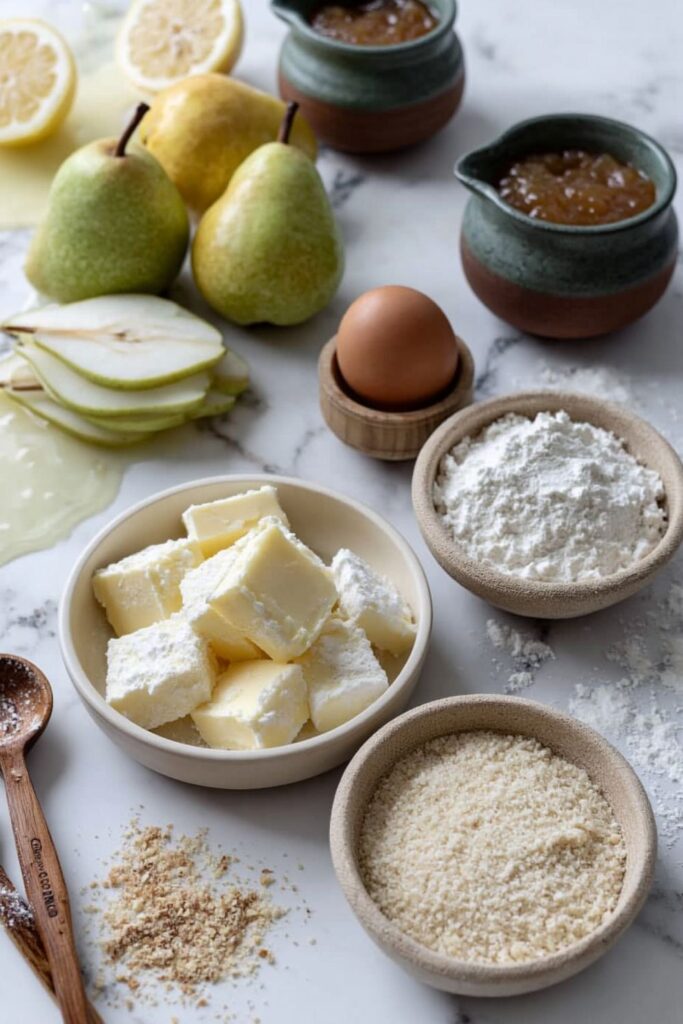- Spread almond cream into the crust and top with lemon-brushed pear slices.