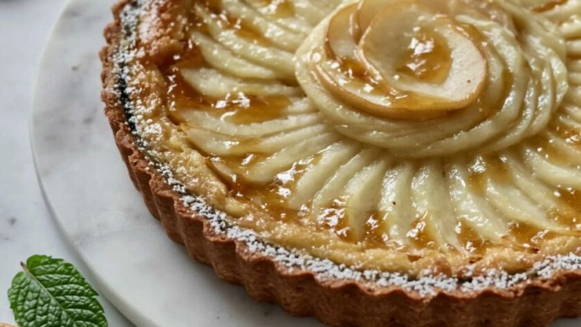 Ina Garten Pear Tart Recipe is a classic French-style dessert featuring ripe pears and almond cream. This elegant tart uses a buttery shortcrust pastry, nutty frangipane, and a glossy apricot glaze.