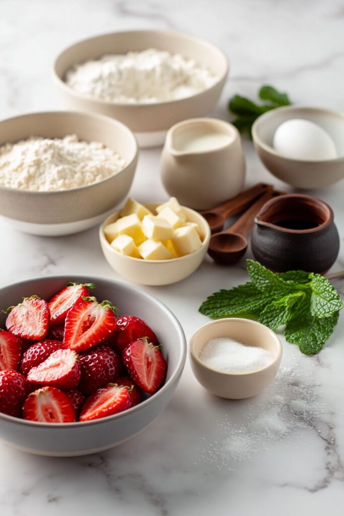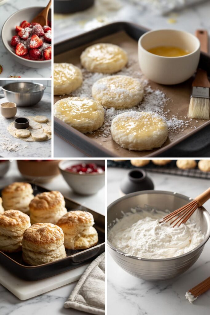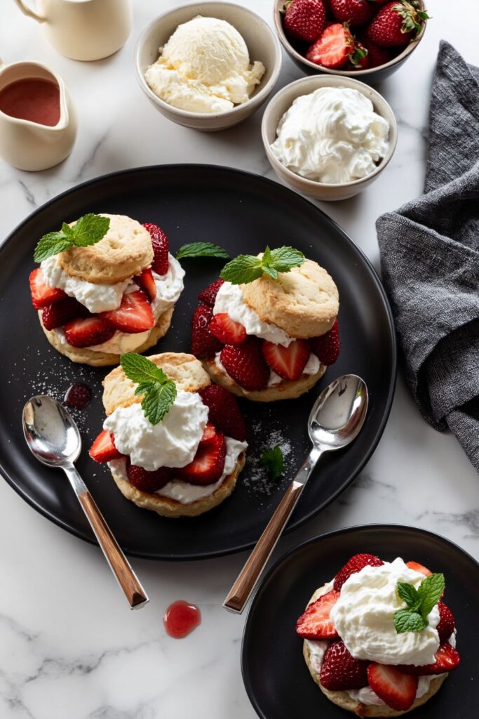 - Assemble: Place a warm or room-temperature biscuit on each plate. Spoon the macerated strawberries and their juices beside it. Add a dollop of whipped cream. Garnish with fresh mint or extra berries if you like.