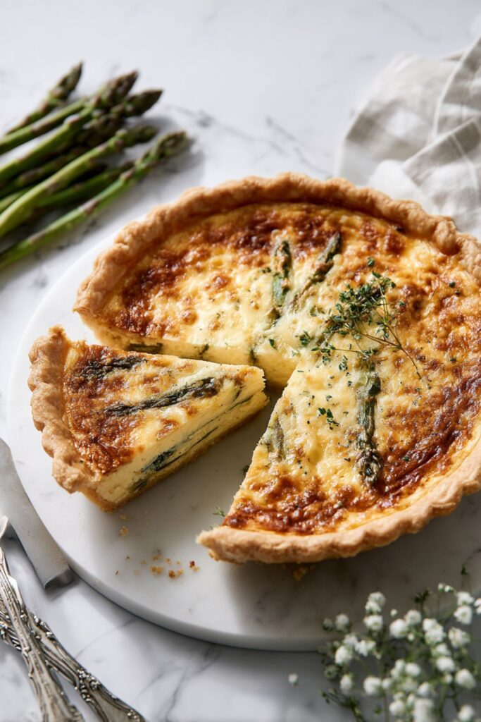 A rustic, wholesome quiche featuring a crisp olive oil crust and a light, savory custard packed with tender asparagus and nutty Asiago cheese.