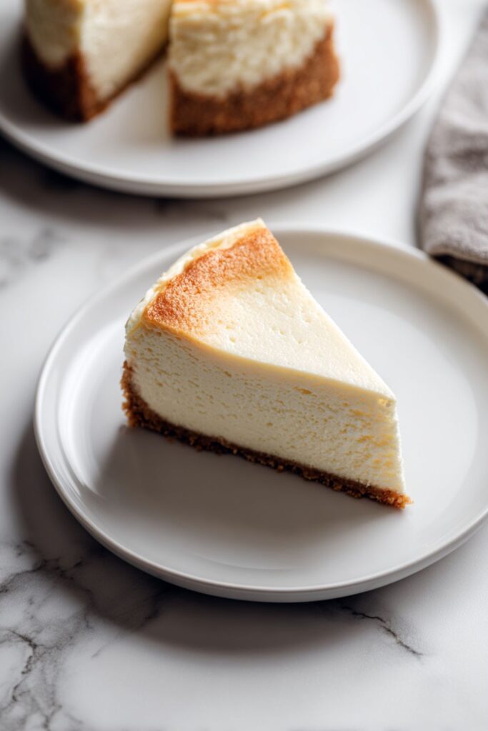 An ultra-smooth, dense, and creamy New York-style cheesecake sitting on a buttery graham cracker crust. The sour cream filling guarantees a tangy, velvety bite every time.