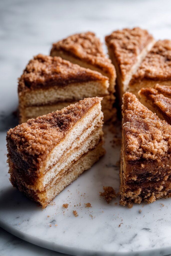 A decadent, double-layered cinnamon cake featuring a hidden spice center and a thick, buttery brown sugar streusel topping.