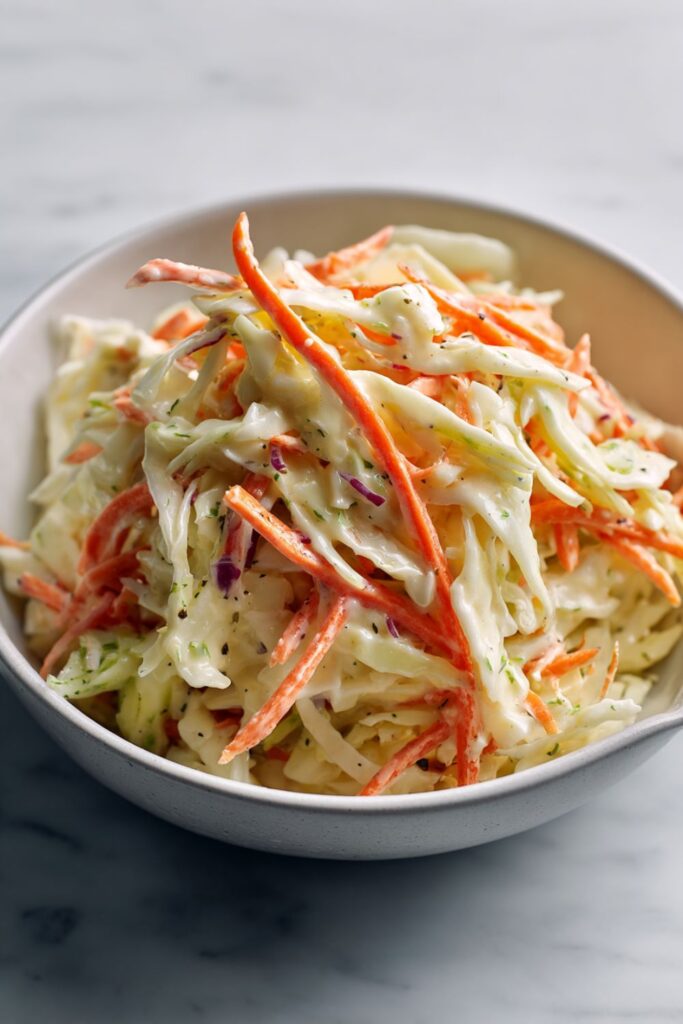 A classic, sweet, and creamy Southern-style coleslaw featuring fresh shredded cabbage and carrots tossed in a zesty apple cider vinegar dressing.