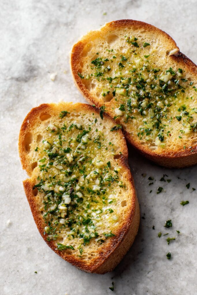 A classic, buttery French bread loaf slathered in a fresh garlic and parsley spread, toasted until golden and crisp.