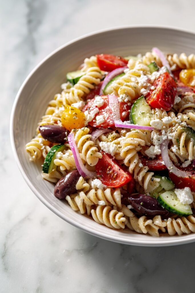 A colorful, crunchy pasta salad loaded with fresh Mediterranean vegetables and salty feta. Tossed in a zesty oregano vinaigrette, it’s the perfect make-ahead summer side.