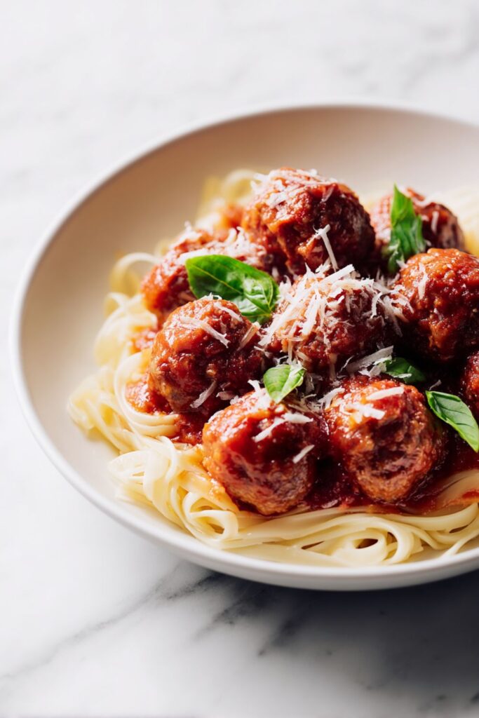 - Serve: Ladle the meatballs and sauce over a bed of warm noodles and finish with a generous dusting of parmesan cheese and a few torn basil leaves. Bring it to the table and tuck in while it’s piping hot.