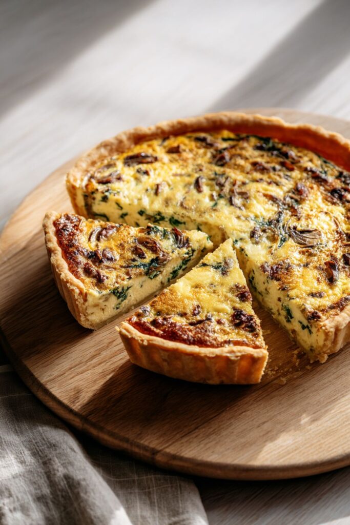 A classic, creamy quiche loaded with earthy mushrooms, wilted spinach, and nutty Swiss cheese. The garlic-infused custard makes every bite savory and satisfying.