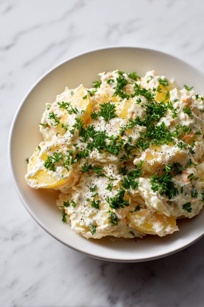 This Joanna Gaines Potato Salad Recipe is a creamy, zesty side that needs a smoky or savory pairing! A slab of Slow-Smoked BBQ Ribs is the classic choice to balance the cool sour cream dressing. For a lighter touch, a piece of Lemon Herb Grilled Chicken adds a lovely brightness that pairs perfectly with the fresh herbs! A cold Glass of Sweet Tea or a Chilled Lager pairs wonderfully with the salty, pickle-infused bite.