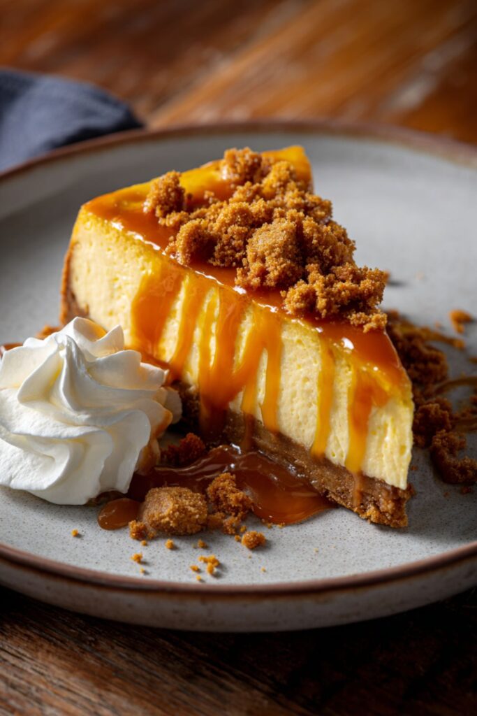 A decadent fall dessert featuring a spicy gingersnap crust, creamy pumpkin filling, and a homemade salted caramel drizzle. The unique freezing method ensures a perfect, dense texture.