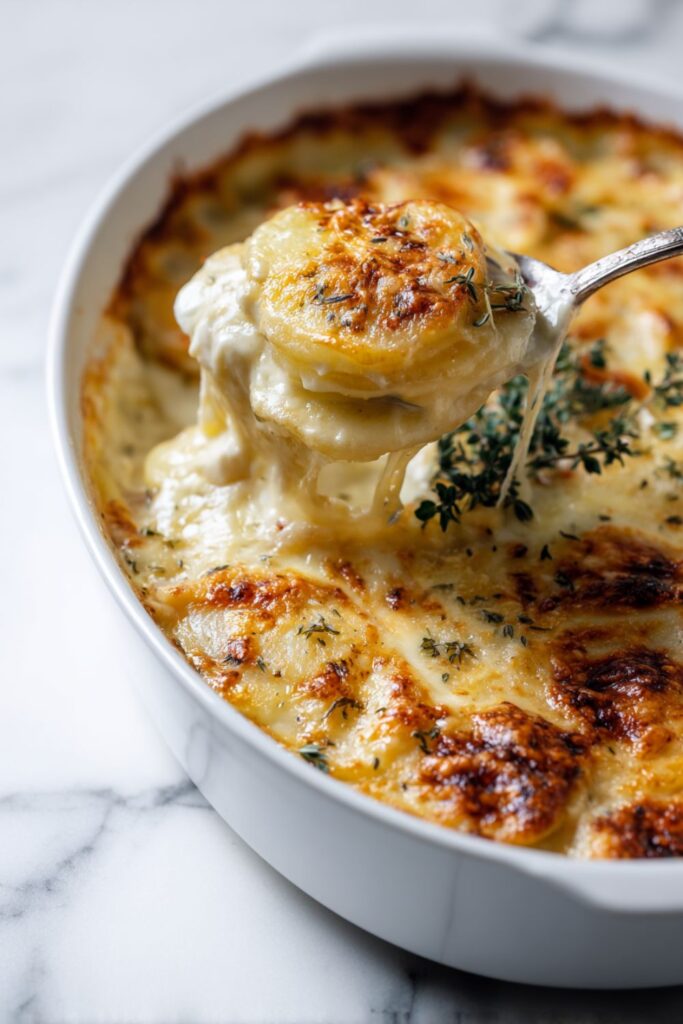 A rich, creamy potato bake layered with garlic-infused cream, thyme, and two types of cheese.